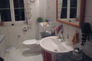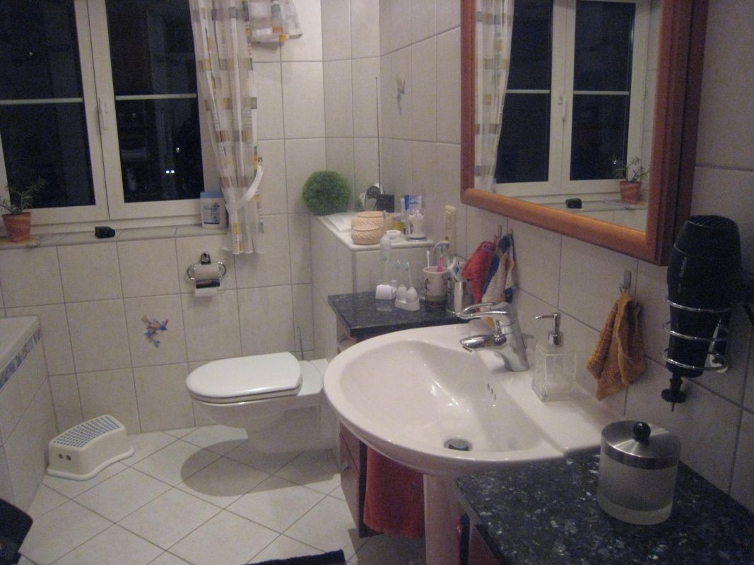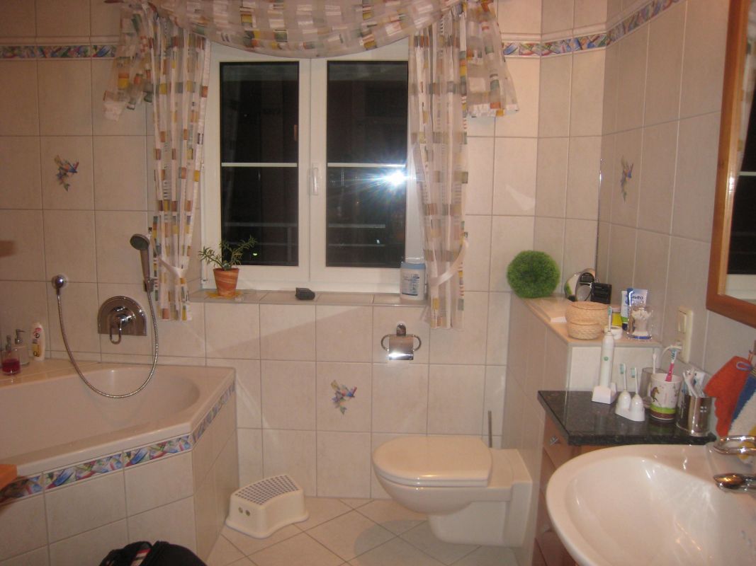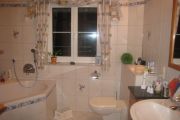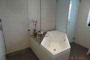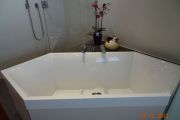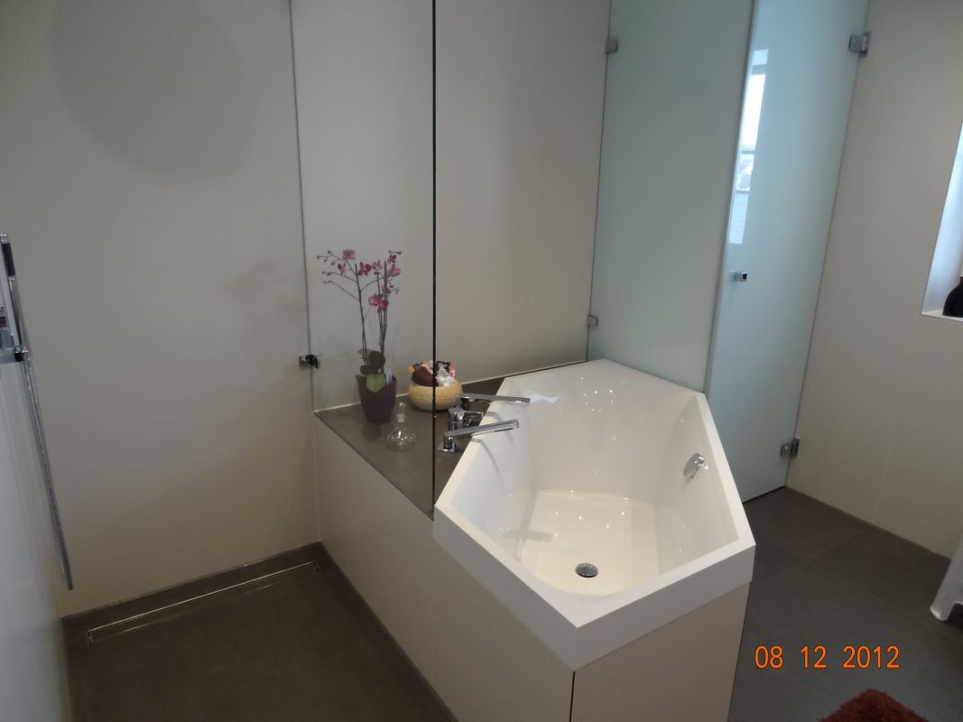 Vollständiger Ausbau des alten Bades. Einbau großflächiger Fliesenvariante mit einer Sechseckwanne als Blickfang und bodengleich begehbarer Dusche.