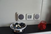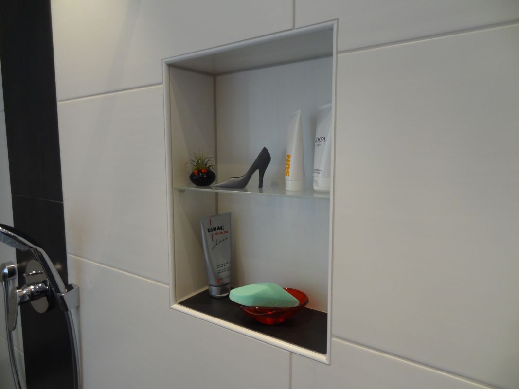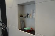 Auf der rechten Seite entstand eine schwellenlose Dusche mit integriertem Sitzbereich, die nicht nur die Sinne verwöhnt, sondern durch das eingebaute Radio das Duschen zu Erlebnis macht. Ein zusätzlicher Eyecatcher ist die in die Wand eingepasste Ablagefläche. Mit einem am Wandheizkörper vorgewärmten Handtuch kann ab jetzt das Wohlgefühl noch einige Zeit nachwirken.
