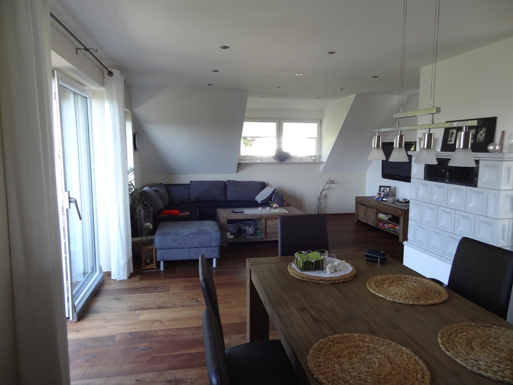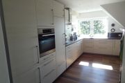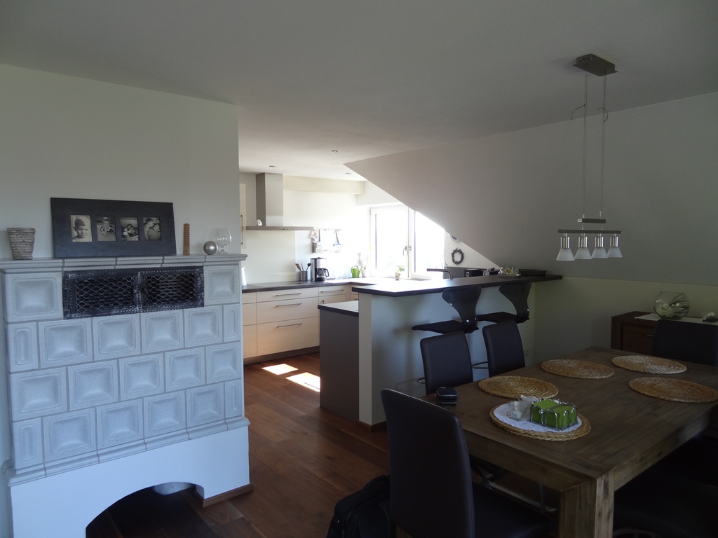 Durch das zusammenhängend konziperte Dachgeschoss (neue Böden und Decke) konnte das gewünschte völlig neue Wohngefühl verwirklicht werden. Der zusätzliche Platzbedarf wurde durch den Einbau einer praktischen Schiebetüre und einem Wanddurchbruch gewonnen. Ein Traum ist die neue Küche mit Theke als Raumteiler. Die besondere Atmosphäre des nun geräumigen mit viel natürlichem Licht durchfluteten Wohn-und Essbereich ist jetzt der neue Wohnmittelpunkt.