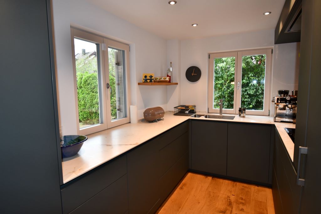 Die Wahl fiel auf edle Materialien mit denen eine stimmige stilvolle Harmonie das Haus jetzt durchströmt. In der neuen Küche lassen sich die kulinarischen Genüsse wieder mit Hingabe zaubern. Das neue Bad bietet ein edles Ambiente, die neuen Rückzugsplätze im Haus sind perfekte Hideaways vom Alltag. Die Entscheidung für die neue PV Anlage auf dem neuen Carport erfüllt mehr als alle Erwartungen. Die Terrasse mit Blick in den Garten ist ein Logenplatz zum entspannen und wohlfühlen. Umbauen ist Vertrauenssache - vielen Dank in das in uns und unsere Kooperationspartner gesetzte Vertrauen und die sehr gute Zusammenarbeit.
