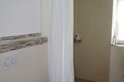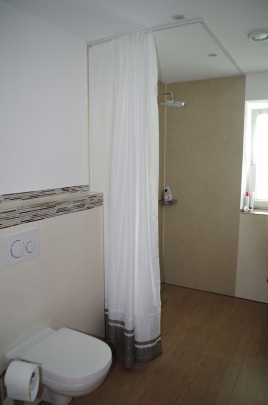 Das neue Bad ist hindernisfrei und auf Wunsch der Kundin wurde keine Duschwand eingebaut. Stattdessen ein großer Duschvorhang angebracht, damit evtl. sogar mit dem Rollstuhl in die Dusche gefahren werden kann.