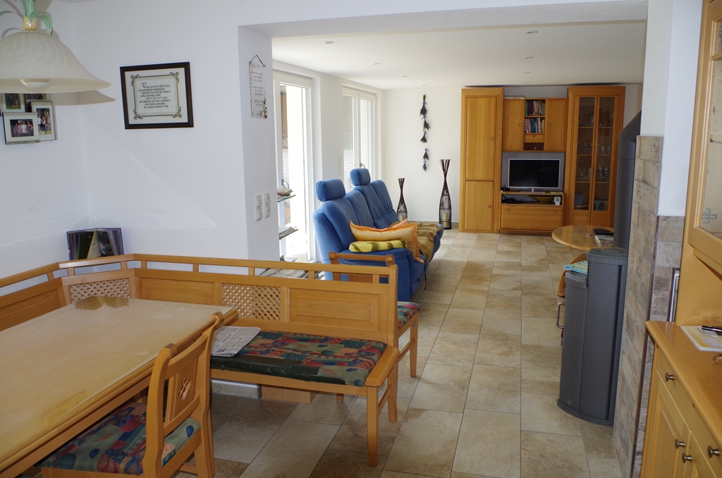 Die Räume im Erdgeschoss sind durch die lange Fensterfront wundervoll hell. Die Küche und Wohnzimmer sind jetzt ein Raum in dem sich alle gerne aufhalten. Auch der Laufstall der Enkelin hat schon einen festen Platz.