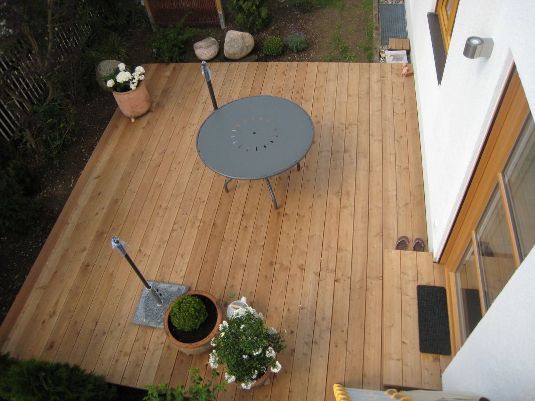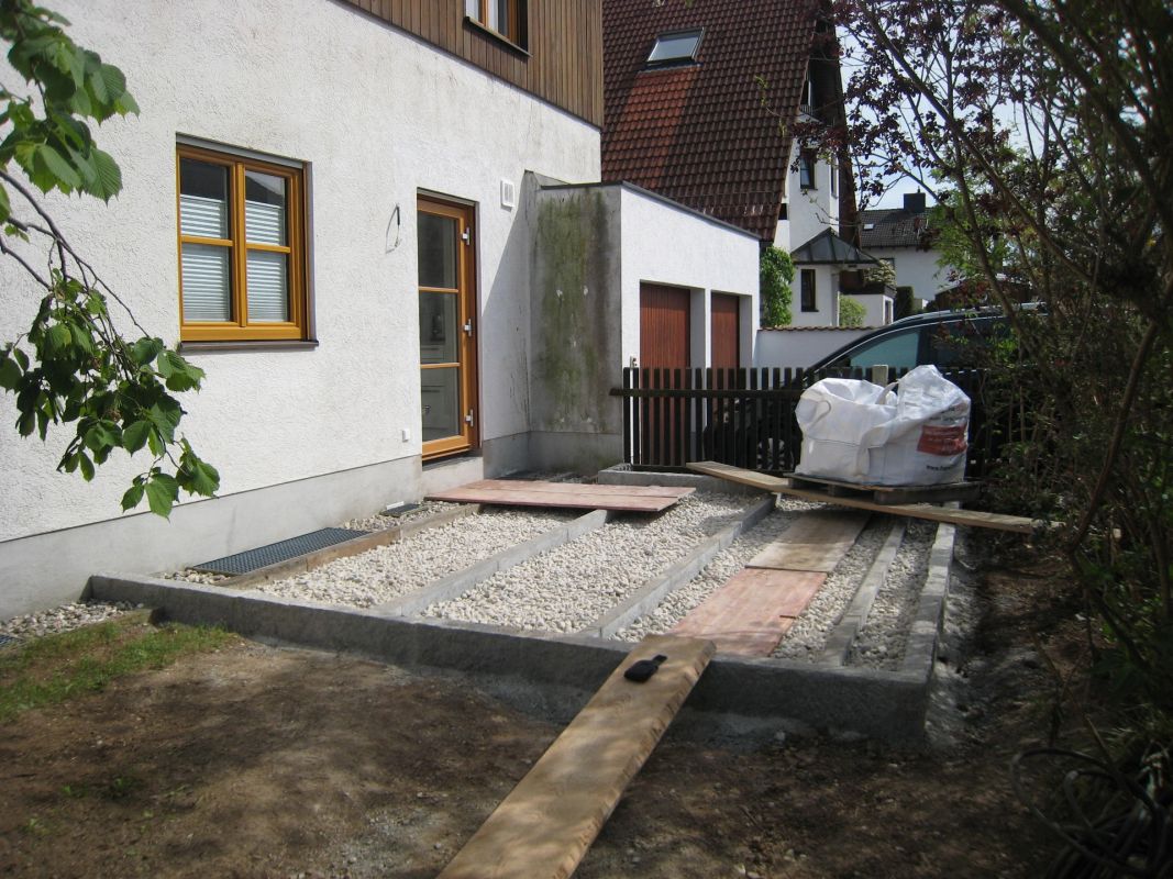 Durch Ausbau des Küchenfensters und Einbau einer sich nach außen öffnenden Terrassentüre ist der Zugang zum rückwärtigen Garten verwirklicht. Die Bewegungsfreiheit in der Küche ist dadurch gewährleistet und erhält viel mehr Tageslicht. Ein „Freiraum“ wurde durch den Bau der Terrasse gestaltet auf den man nicht nur gerne einen Blick von oben wirft, sondern der von Familie und Freunden rege genutzt werden kannt.
